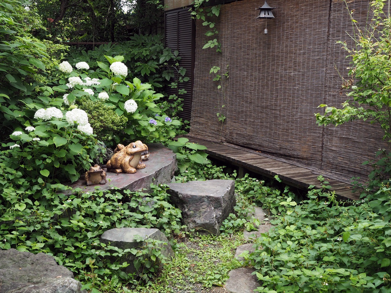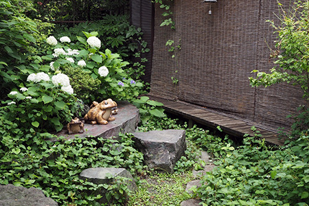 庭のはずれにある縁側は人気のスポットです。 梅雨時には紫陽花が咲きます。