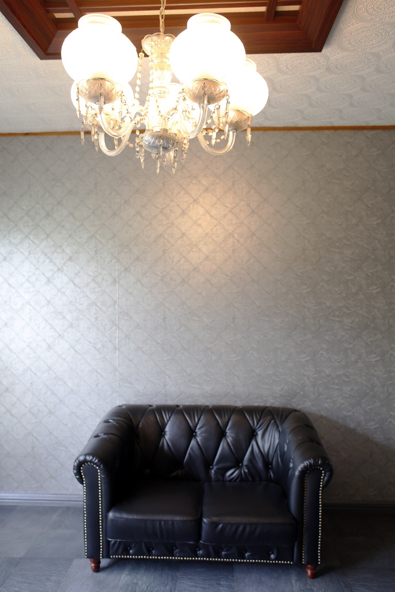 黒基調のゴシック部屋。左右で壁のデザインが違います。