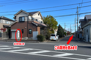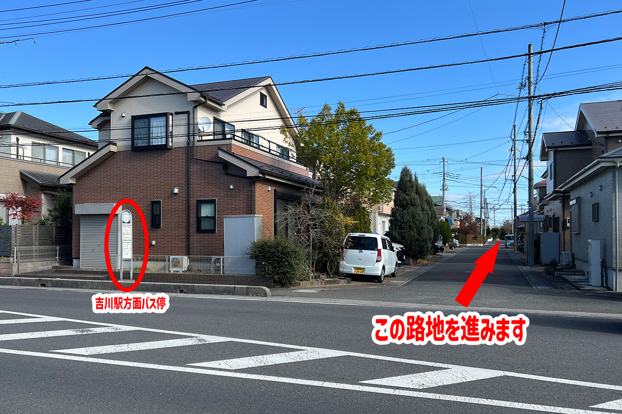 ネオポリス北バス停を降りましたら道路向かい側をご覧ください。 反対方向(吉川駅方面)のバス停の横の路地を入って道なりに250m進みます。