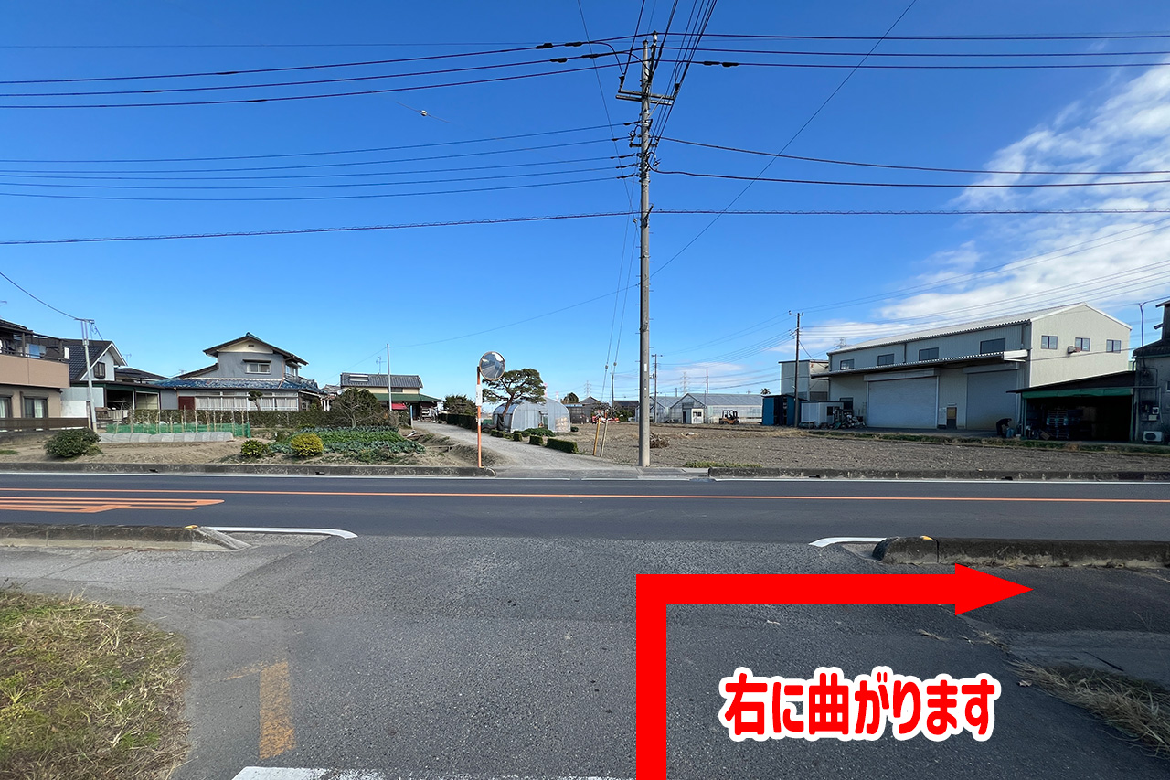 車通りの多い道に当たりますので右に曲がり150m進みます。