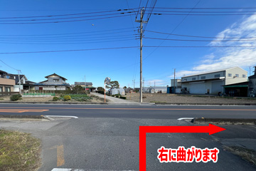 道なりに650m進み、「昭和樹脂」の工場を超えてすぐの白い家の角を左に曲がります。