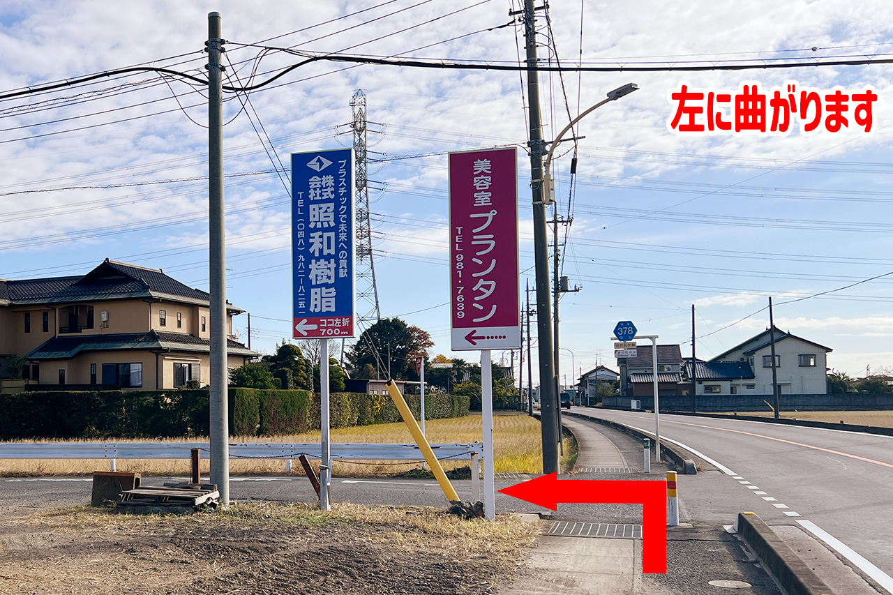 「昭和樹脂」と「美容室プランタン」の看板の角を左に曲がります。